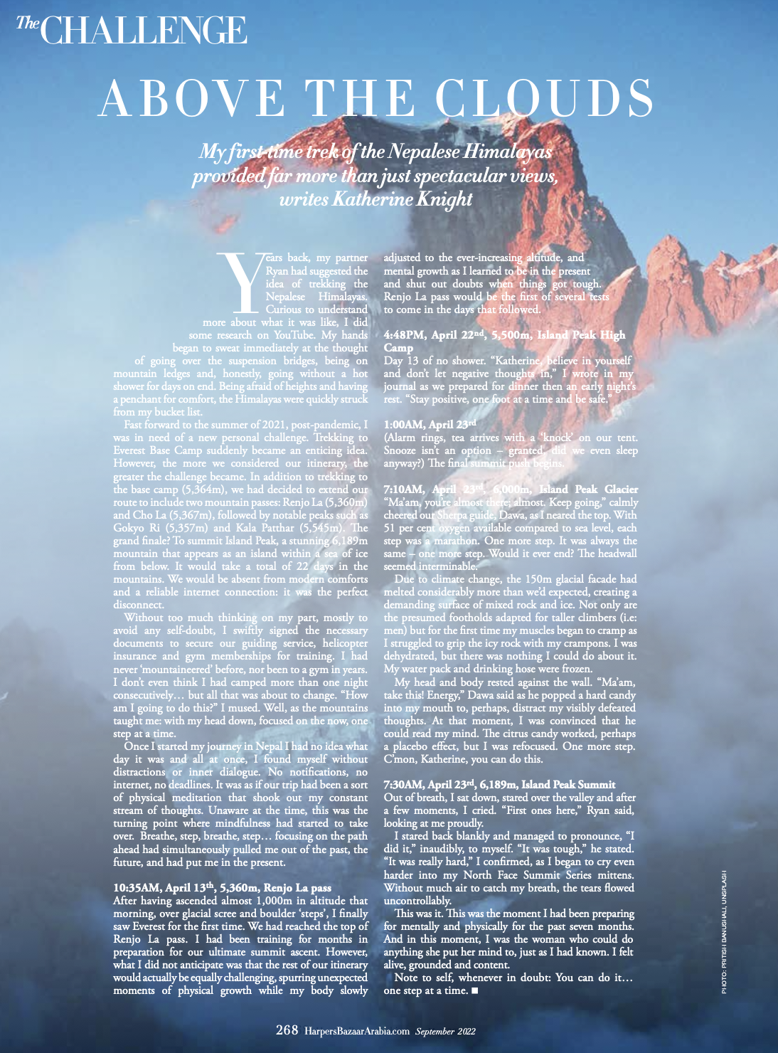In this personal travel piece, “Above The Clouds”, Katherine recounts her first trek in the Nepalese Himalayas, a challenging 22-day journey that tested her both physically and mentally. Despite her fears of heights and discomfort, she pushed herself to conquer Everest Base Camp and summited Island Peak at 6,189 meters. Along the way, she found unexpected mental clarity, learning to focus on the present moment and to take life "one step at a time." Her story is a powerful reflection on perseverance and self-belief.
